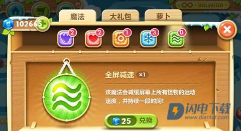 1消耗25颗宝石可获取一种特殊道具,使用后能让所有可见怪物的移动速度大幅降低,效果持续5秒,是应对危机局面时的重要助力。