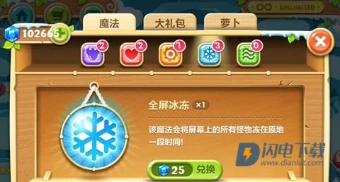 2、全屏冰冻:只需25宝石即可获取全屏冰冻,冻结所有怪物,持续5秒,让敌人无处可逃。