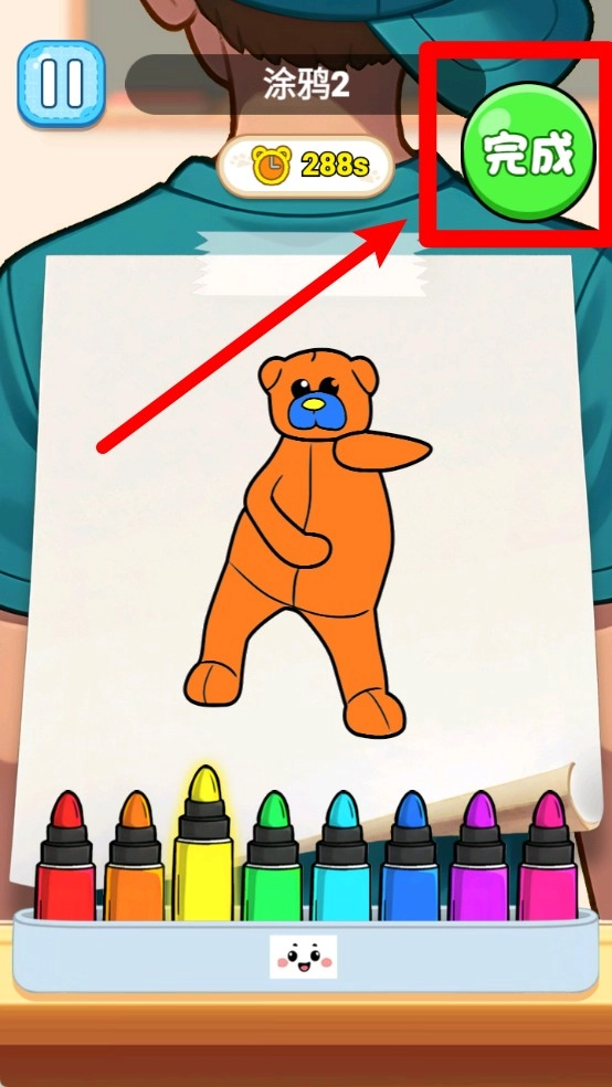 2.绘画过程:在规定时间内使用彩色画笔为图案填色,完成后要点击完成按钮提交,确保作品保存并进入通关判定。