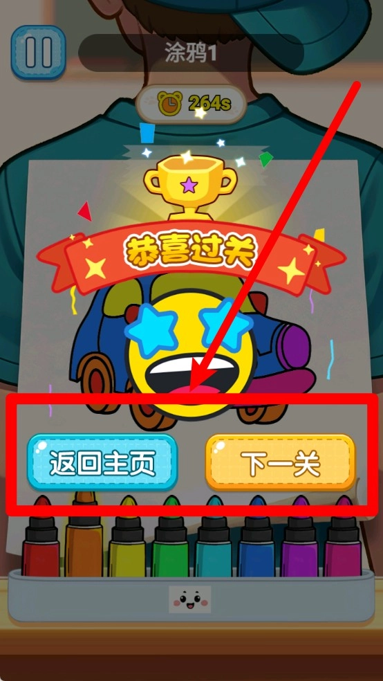 3. 完成关卡:当任务完成,系统会展示过关提示。此时,玩家能够选择返回主页重新开启,也可以点击“下一关”,继续进行新的绘画挑战内容。