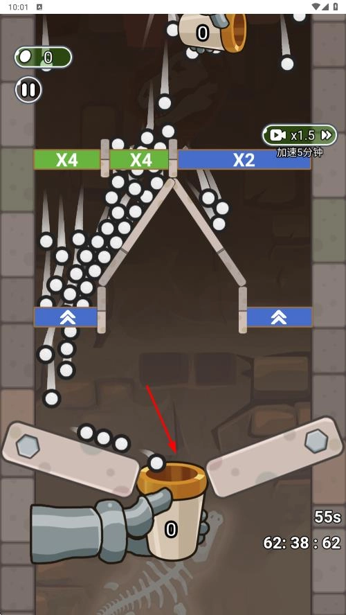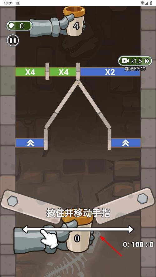 2、在道具界面,按住标【0】的杯子左右移动,依据【X4】【X2】区域,规划白球下落路径。