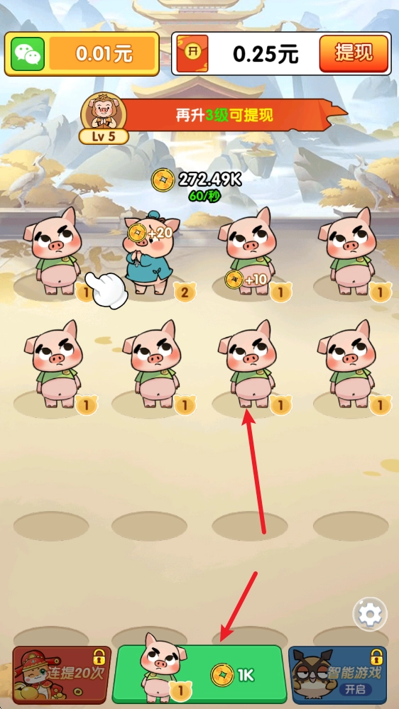 1、进入游戏,点下方购买按钮解锁小猪,拖相同等级猪到一起,合成更高等级,每合成一次,收益和红包进度都+1。