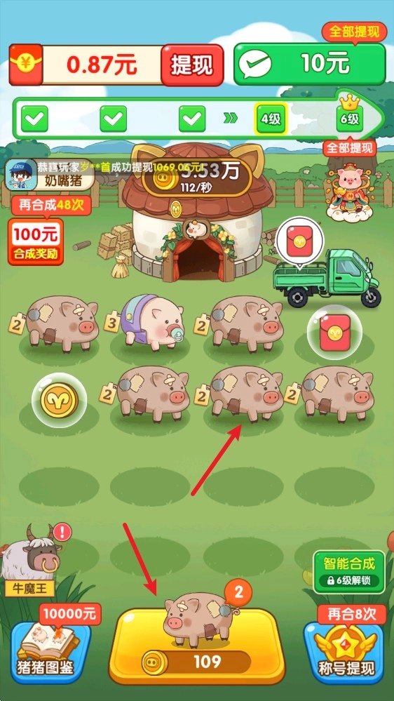 2、盯着提现门槛,比如差几元到10元,集中合成能领红包的高等级猪。