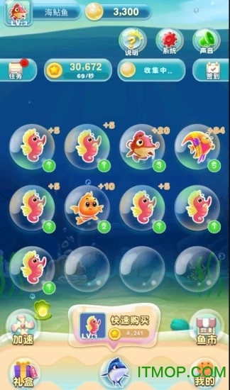 在这款趣味渔场主题游戏里,你能化身渔场经营者,通过轻松的召唤与合成操作提升鱼类等级,每只升级后的鱼都能持续产出珍珠;完成各类任务还可解锁钻石奖励,用于兑换丰富多样的福利。