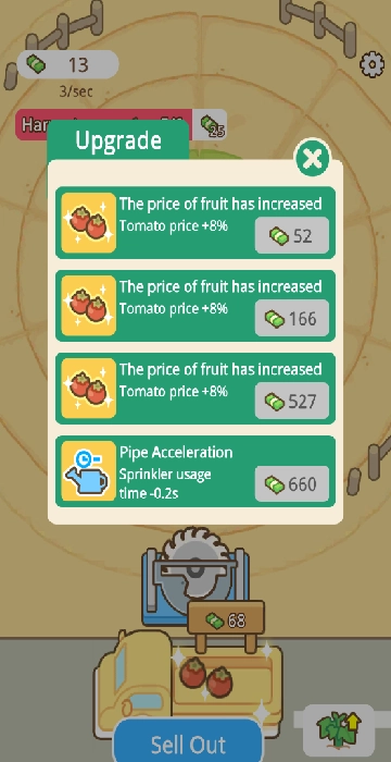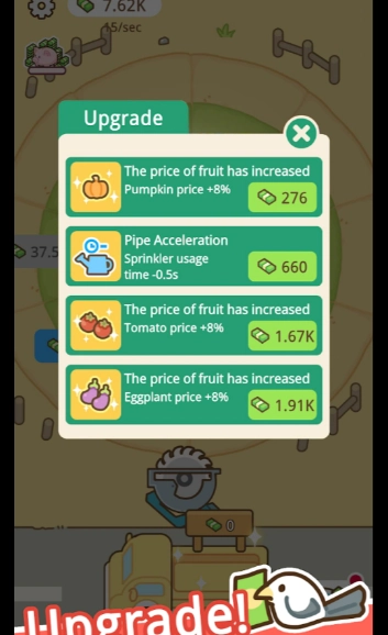 3、通过金币购买升级,如提升洒水速度、扩大耕作面积等,提高农场的生产效率。