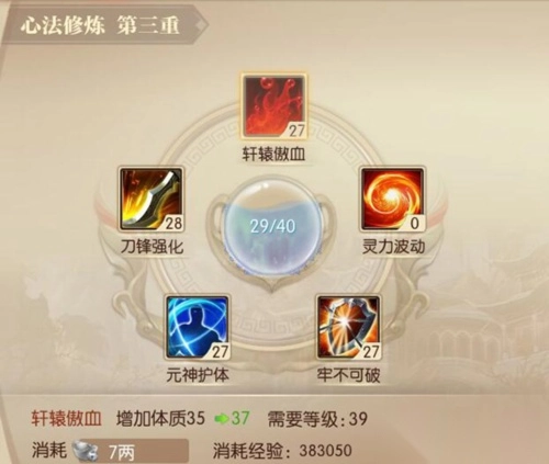 6、还有心法修炼,也是技能的一部分,消耗一定的经验,可以对心法进行升级,修炼心法,可以提高玩家的攻击力,血量以及防御力。当心法升级到一定的等级,还可以突破,并获得压制点数,玩家可以根据自身装备的魔防物防或者自身喜好来加点,装备明明好,却还打不过,答案就在这里。