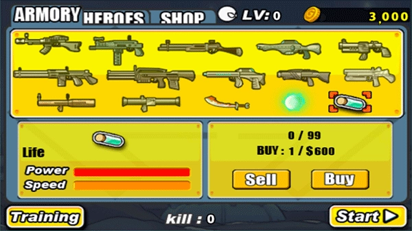 1、首先,确保你的火柴人拥有足够的金币。打开“LOAD GAME”,并点击“NEXT”(针对初次玩家)。进入第一关后,无论你是在第一关还是后续的关卡中,都应优先考虑购买能量球,即此道具,并随后购买满格的生命值。