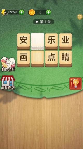 1. 第一关,答题形式为成语,通过选择或点击输入答案。