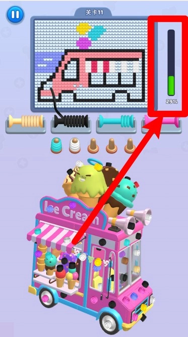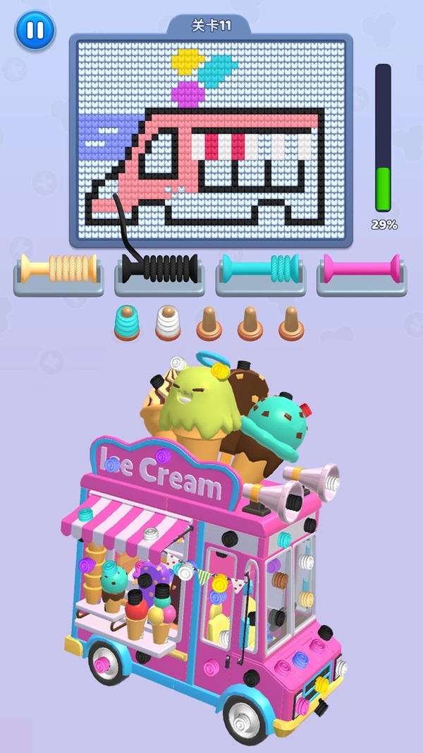 3. 右侧的进度条会实时呈现完成程度,在绘制过程中,要使用黑色与蓝色毛线,按照顺序填充相应区域,逐步勾勒出冰淇淋车精致的像素画造型。