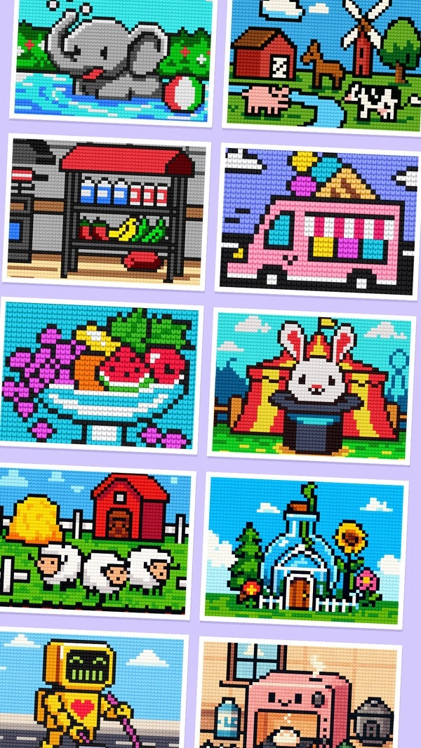 1.画面展示多个像素拼图作品,玩家可自由选择喜欢的图案进行挑战,每个拼图都有不同的主题与丰富的色彩搭配。