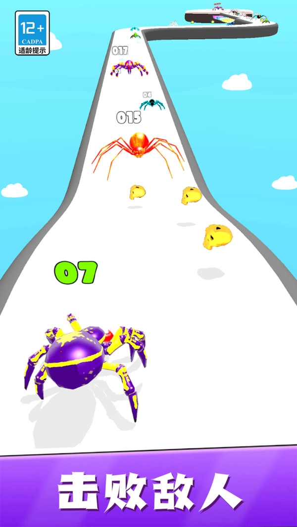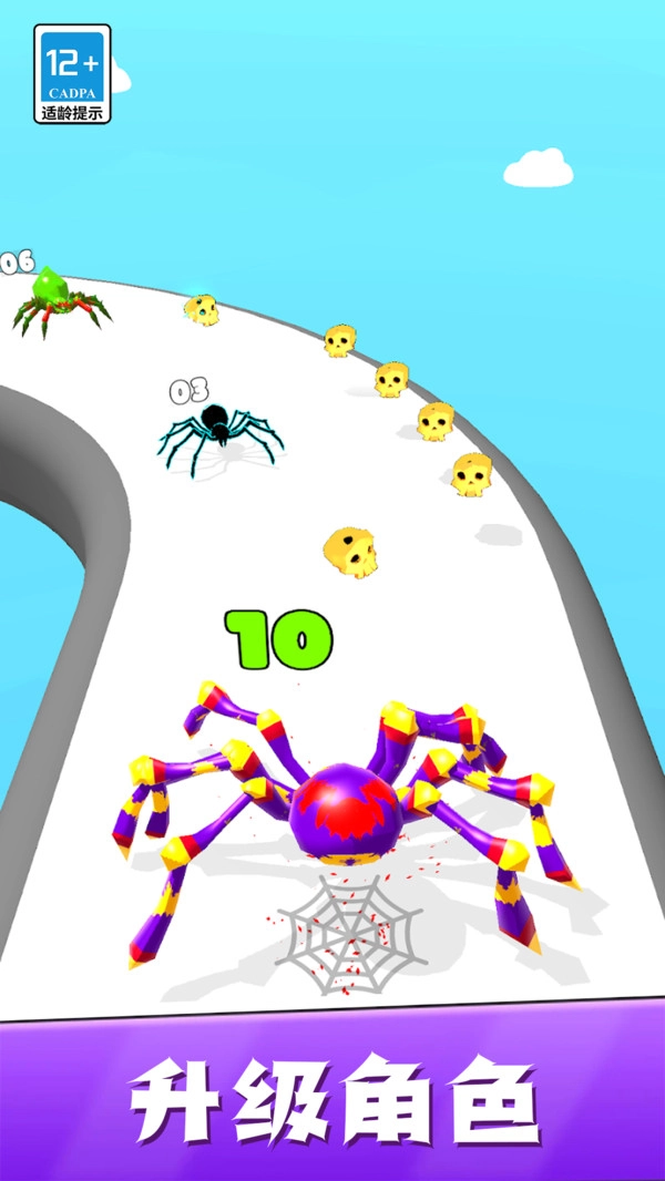 1、从一个小蜘蛛开始,不断的冒险,小心的躲避比你大的蜘蛛。