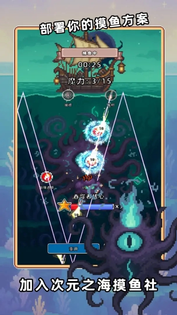 摸鱼神力社是一款全新的轻沙盒类型游戏。在游戏里,你将航行于奇幻的次元之海,穿梭于人间、天堂、地狱,甚至克苏鲁的诡谲维度,捕捉形态各异的鱼灵。这片神秘海域中,散布着无数充满未知的海洋奇境,等待着你去探索发现。摸鱼神力社以像素风格打造,游戏规则简单,上手毫无难度,而且每一个战斗场景都精彩刺激!