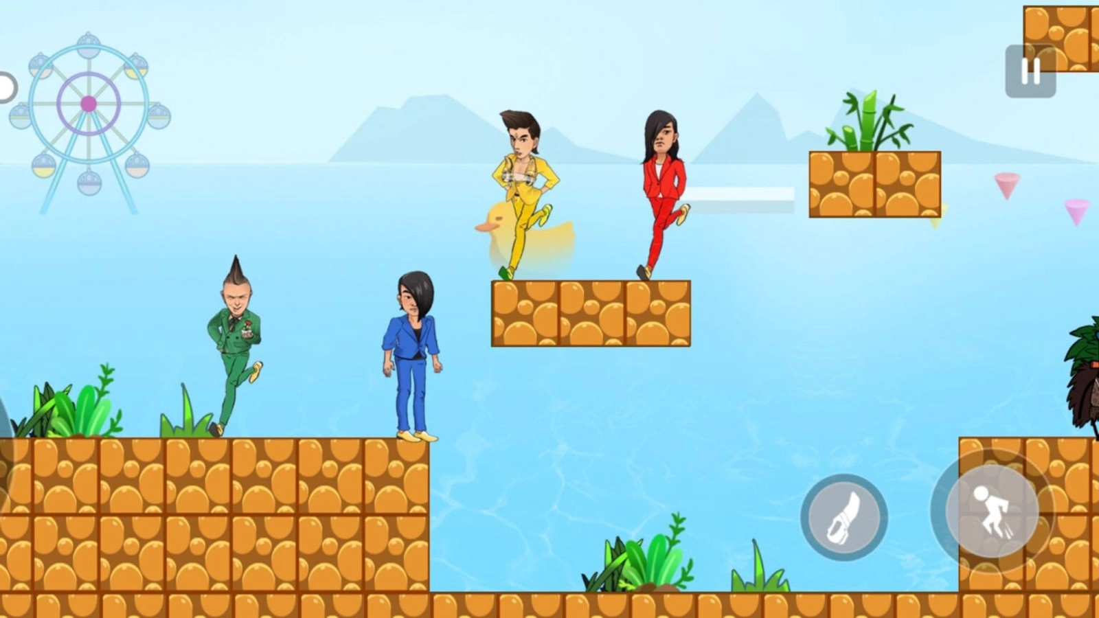 4. 第一步,点击攻击按钮,利用投掷靴子的方式对怪物发起攻击。紧接着,在角色跳跃的瞬间,控制其向前移动,如此便能成功跨上平台。凭借灵活的操作,向着终点进发吧!
