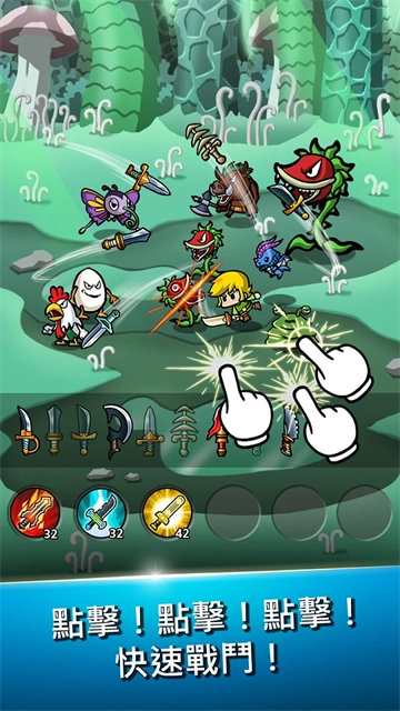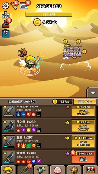 总体来说,游戏的难度不大,也不氪金,就是比较肝,点击界面可以让你更加轻松的解决迎面而来的BOSS,通过升级各种形态的武器,享受这些武器带来的效果加成。