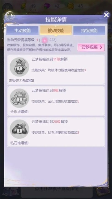 ※ 被动技能默认解锁后自动生效,主要为提供棋盘合成过程中的道具使用收益;