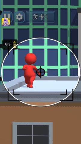 1. 进入关卡后,通过滑动屏幕操作来调节瞄准镜,使其对准屋顶上的红色敌人,接着点击按钮进行开枪射击。