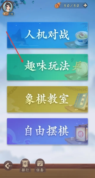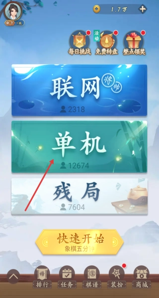 1. 进入游戏,在主界面可选择“单机模式”或者“联机玩法”。首次体验的话,建议先从单机模式的入门难度着手,借此熟悉象棋的基础走法及规则。