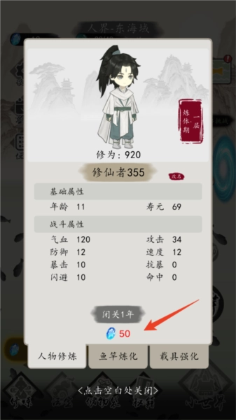 9、然后玩家就可以一开始修炼了,修为和后续的战斗成功率挂钩。