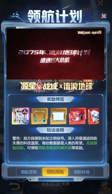 点击【领航计划】观看联动PV,下方可查看流浪地球联动的活动和奖励预览