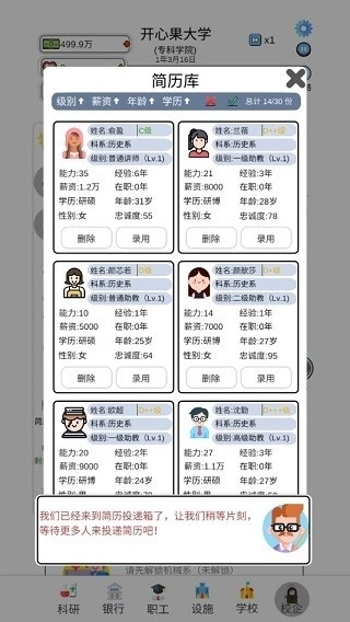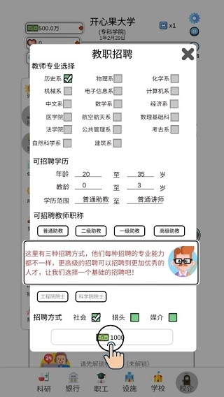 2、一所刚成立的学校,先组建教师队伍,按图中指示点击 “招聘”,搭建初始团队。