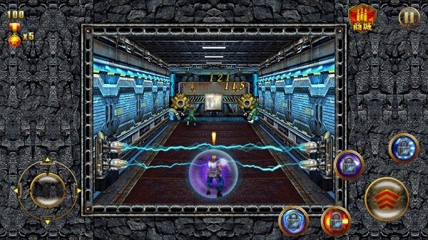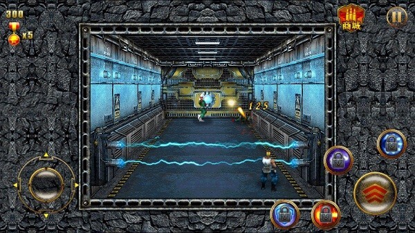 进入堡垒后,便抵达第二关的场景。需要留意的是,每个小关在通关前都会有一道电网阻挡,若未摧毁机关就贸然前进,会被电网电到,陷入约1秒的硬直状态无法行动。通关的方法很简单,只需击毁每小关出现的镜面机关——镜面机关被摧毁后,关卡内其余的炮台和小兵都会一同消灭。