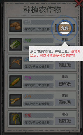 幸存者增加后,现有食物储备支持不了多长时间,点击"农场"按钮,种植一些作物