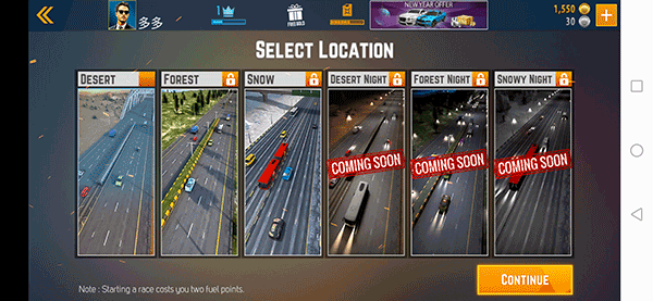 找到并点击“long drive(长途汽车模式)”,该模式内共有三张场景图,分别对应desert(沙漠)、forest(森林)和snow(雪地)。每张图包含白天和黑夜两种状态(其中黑夜模式暂未开放),你可以任意选择一张未上锁的图开始游玩。需要注意的是,上锁的图需通过以下方式解锁:在免费图中赚取游戏货币、直接充值购买,操作时可选择cancel(取消)、confirm(确认)或purchase(购买)。