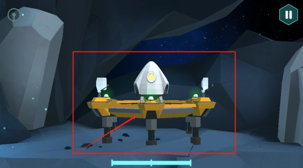 3、这是游戏画面,火箭停在黄色平台上,周围有岩石和星空背景。