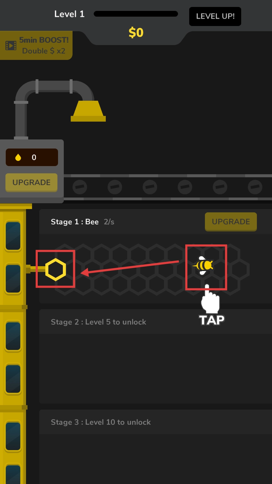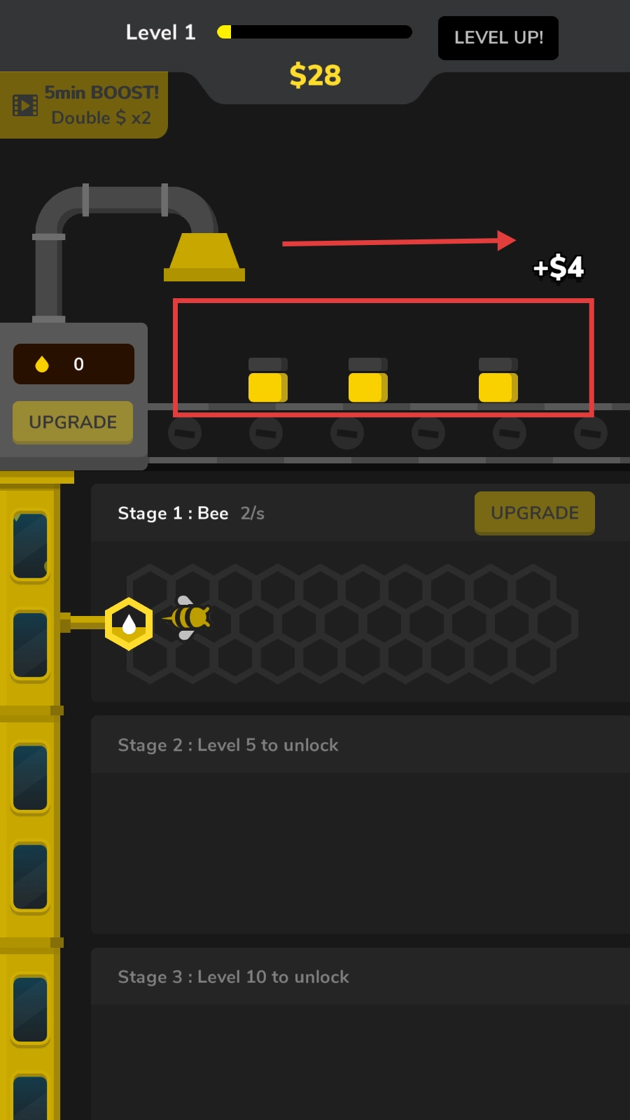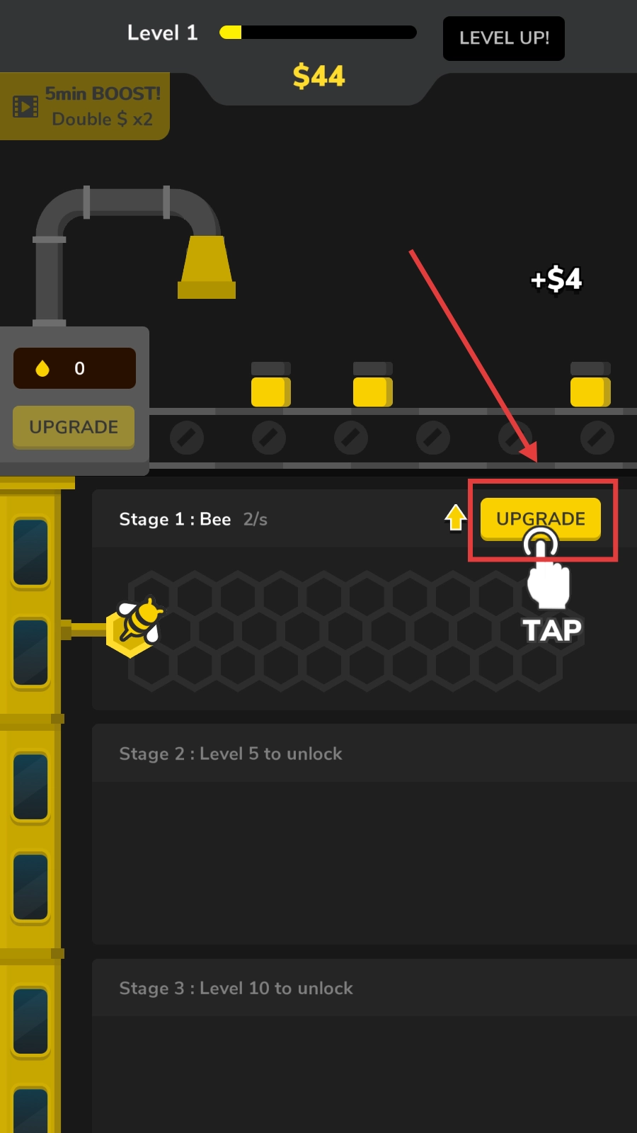 3、攒够钱后,点击Stage1旁的【UPGRADE】,提升蜜蜂采蜜效率,加快赚钱速度。
