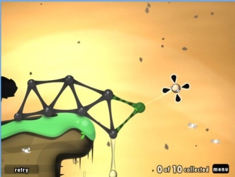 1、操控黏性小球构筑一座跨度夸张的吊桥,注意物理重力会让球体自然下垂,拉远距离是关键。