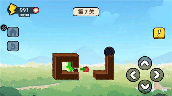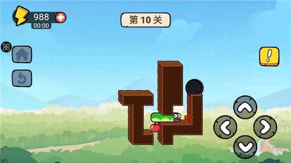 往前移动,然后往下转一圈。接着再往前,再向上。再往左边移动,吃掉苹果,再向右移动。往上移动,再往左边移动。然后就能出去了,爬到黑洞方向即可。