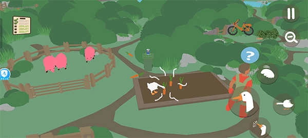 大鹅模拟器的故事设定在一个平和静谧的农场里。某个阳光灿烂的清晨,你化身成一只调皮捣蛋的大鹅,目标就是溜进人类的屋子,四处制造各种混乱状况——像是偷走园丁的钥匙、把他的工具藏起来、利用洒水器喷湿人类,还有偷吃食物之类的。