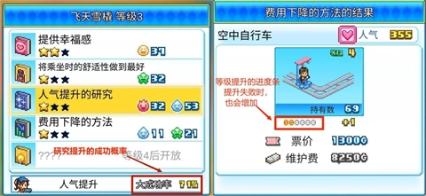 3.研究设施有失败的概率,在右下角可以查看成功概率,成功时可以点亮星星获得提升,比如费用下降,成功时维护费下降,但失败时维护费不会下降,但仍旧可以获得等级提升进度条的增加,也可以获得一个蓝票获取进度,增加的进度为本次研究情绪使用的数量,进度条满了之后会获得一个蓝票,蓝票可以提升研究成功率至100%。