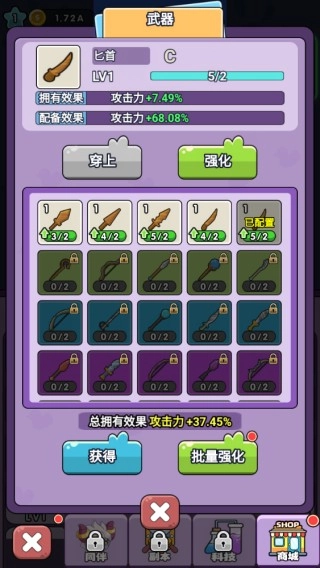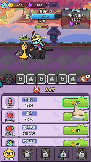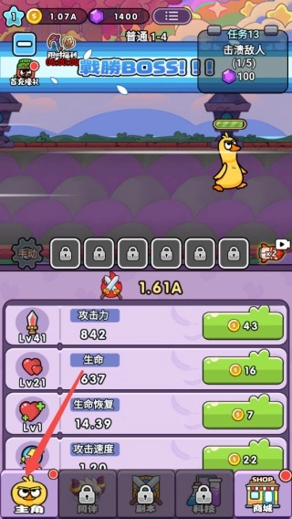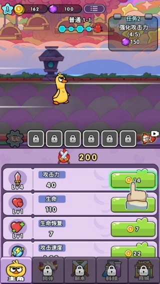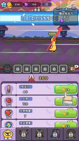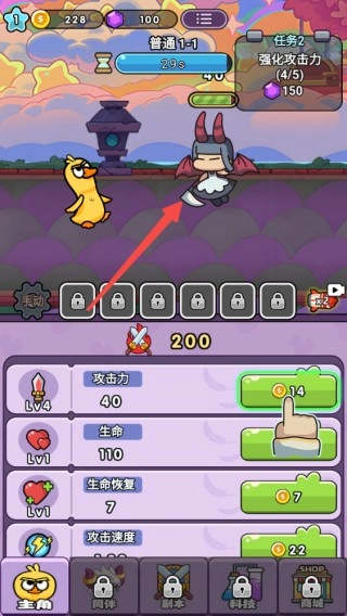 2、使用金币升级攻击力、生命、生命恢复、攻速、暴击等;