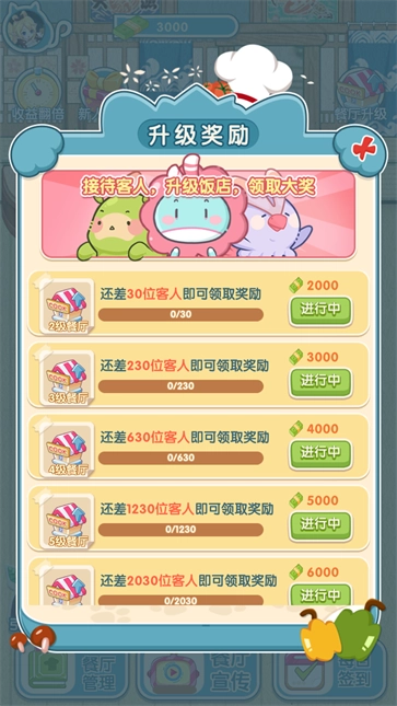 2、食堂需要满足更多客人就餐需求,完成任务目标收获金币增强经营规模。