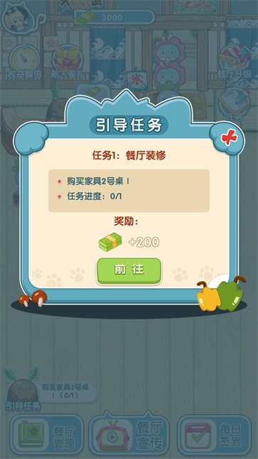 1、达成目标任务增强餐厅品质扩大餐厅面积,治愈经营之旅就从现在开始。