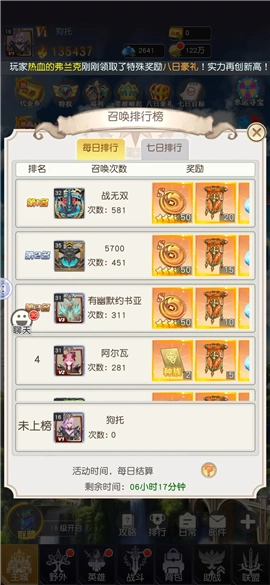 6、召唤排行榜:(持续7天,奖励给5000钻石,有机会就拿,没机会也不强求)