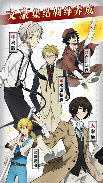 怀有文豪之名的游戏角色集结,无论是号称横滨F4的中岛敦、太宰治、芥川龙之介、中原中也,还是两大组织的头目福泽谕吉、森鸥外,还有泉镜花、江户川乱步、织田作之助、坂口安吾、费奥多尔等各种人气角色,你都有可能召集他们,成为队伍中的一员。