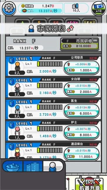 4、扭蛋城市一共分为10个区域,每个区域都可以开发升级,另外,还可以通过【升级机器】或者【市民研修】来增加收入。