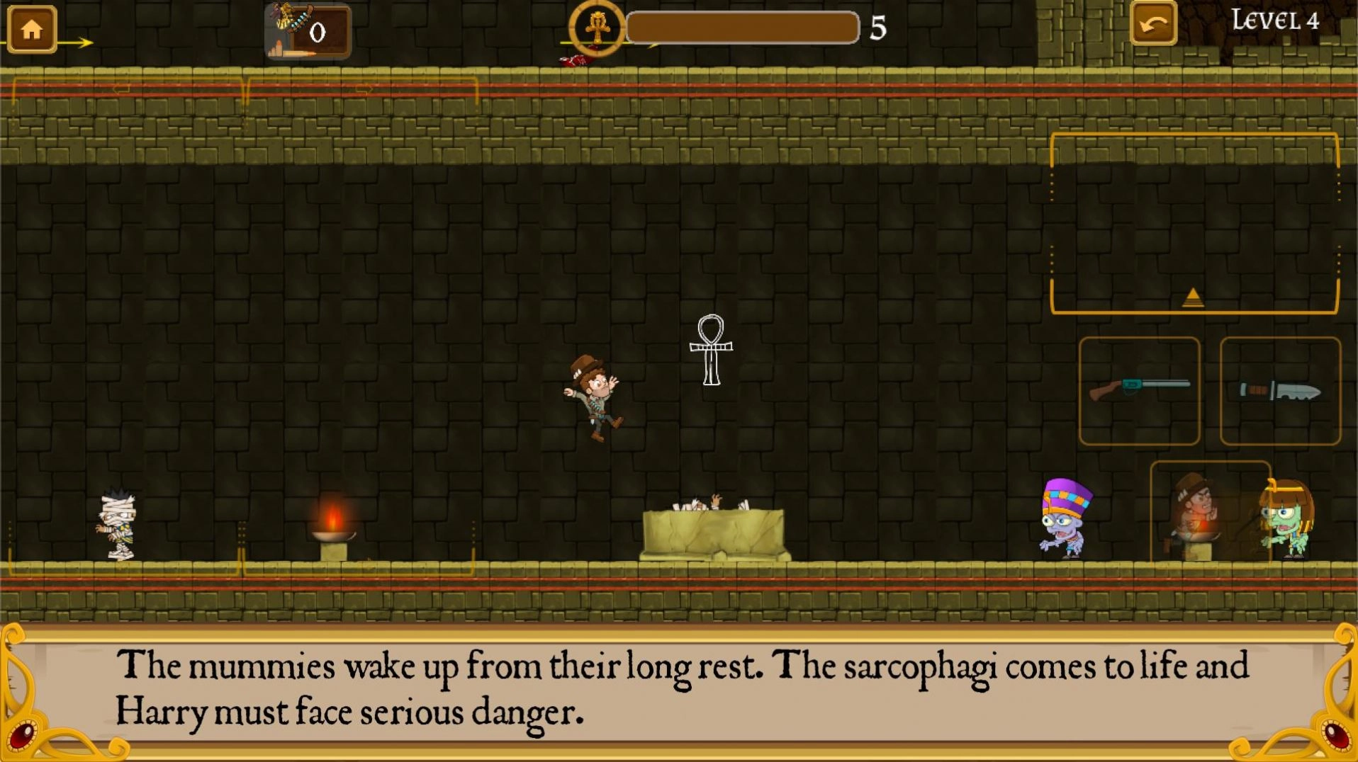 这是一款横版益智闯关类游戏。故事中,一位冒险者发现了一座神秘的金字塔,于是他决定深入其中,探寻那尘封多年的秘密。然而,随着他的深入,危险也接踵而至。此刻他已无退路,只能奋力寻找钥匙,击败木乃伊,为自己开辟一条生路。