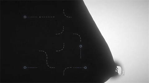 最后一个谜题是对两个黑色剪影形状的组合。调节它们的角度,让它们拼合成一体,仿佛是一件拼图游戏。之后,旋转下面的圆盘,开启一处安宁的出口,结束这场梦境。