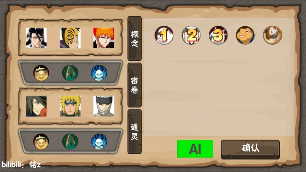 3、进入选角界面,选择三个角色组成队伍,在挑选三个对手,同时,玩家还需要择取得三个不同的密卷以及通灵,玩家需要谨慎选择,密卷和角色的搭配是很有战略的,控制替身的机遇也很重要。