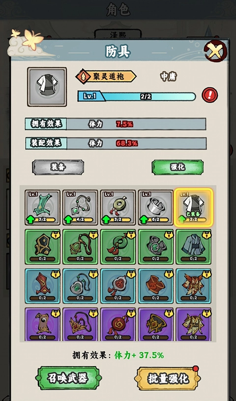 2、装备:游戏内有着武器、防具、法宝等六种装备,玩家可以注意解锁进行穿戴,提高角色基础战力。