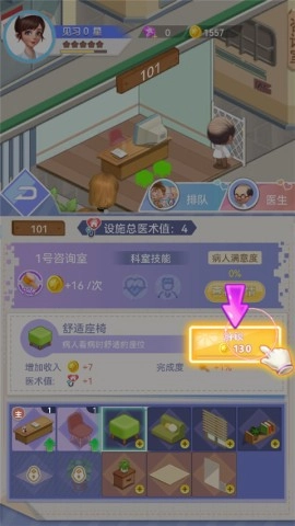 5、当积累到足够的金币后,可以解锁设施,从而提升医生的医术水平;