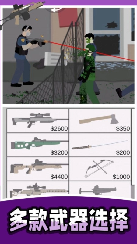 玩家轻松的选择各种类型的武器,狙击枪、步枪、手枪等,欢乐多。