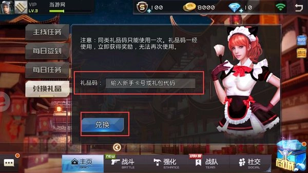 3.在兑换礼品界面输入礼品码点击【兑换】按钮完成礼包的领取