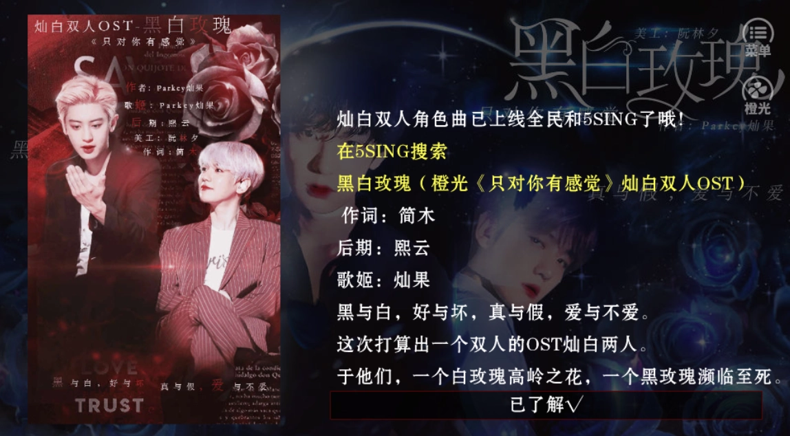 灿白双人角色曲已上线全民和5SING了哦!