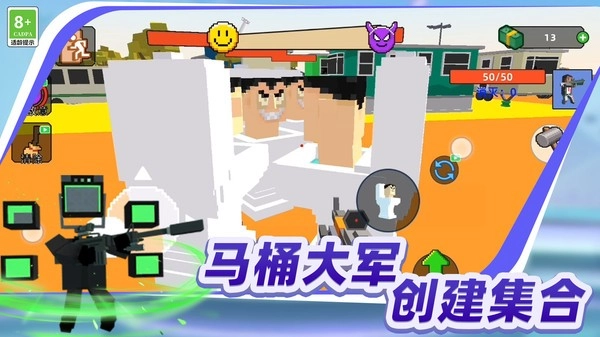 沙漠特种兵这款游戏玩起来轻松愉快,无需氪金也不用肝,有各种各样的人物可供选择,还有刺激的沙盒对决玩法,赶紧召集你的马桶大军,一同并肩作战吧!