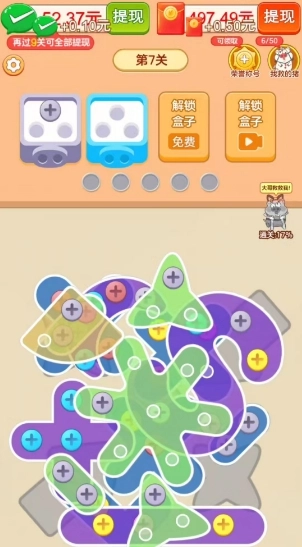 1、不同颜色的螺丝钉等你去点击消除,只有相同颜色的螺丝才可以放在盒子中。