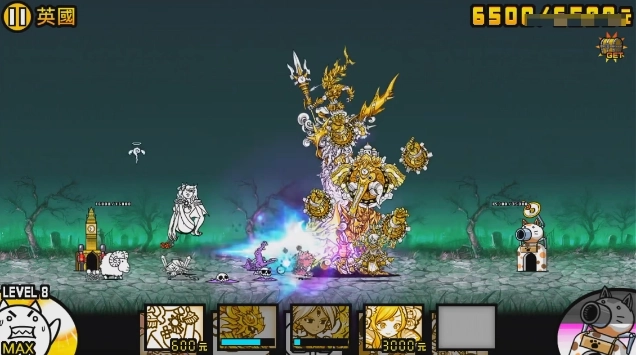 敌人的城堡数值终于突破2万大关,达到了25000。这一关我建议大家尽量把所有兵种都升级到最高级,尤其是巨神喵——升级成喵大帅后,它不仅坦度拉满,输出也相当给力。现在基础兵种的作用主要是拖延敌人进攻节奏、积累资金;而这关的对手还是老面孔,得等敌人派出喵颈鹿后再出兵才有胜算。喵大帅出2到3只就足够了,剩下的输出可以交给喵UFO、喵龙和喵鲸来负责。
